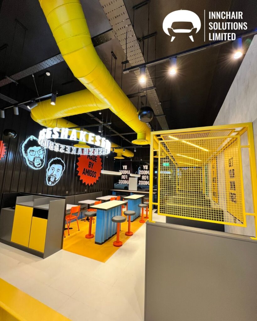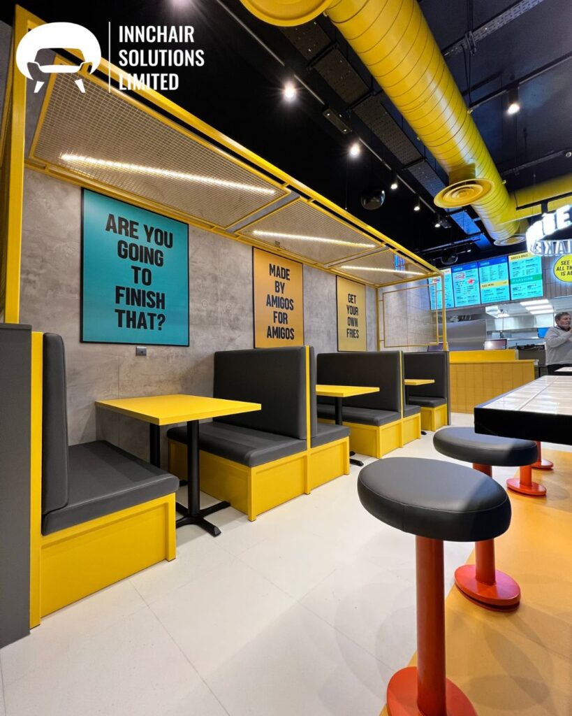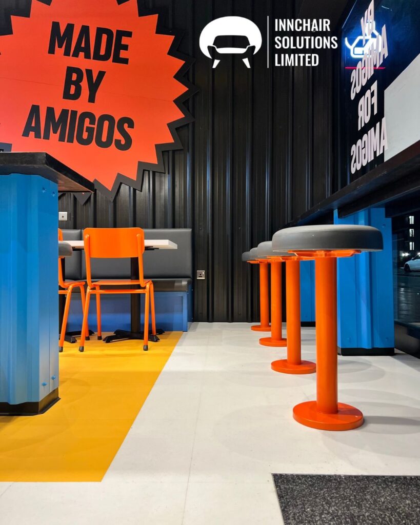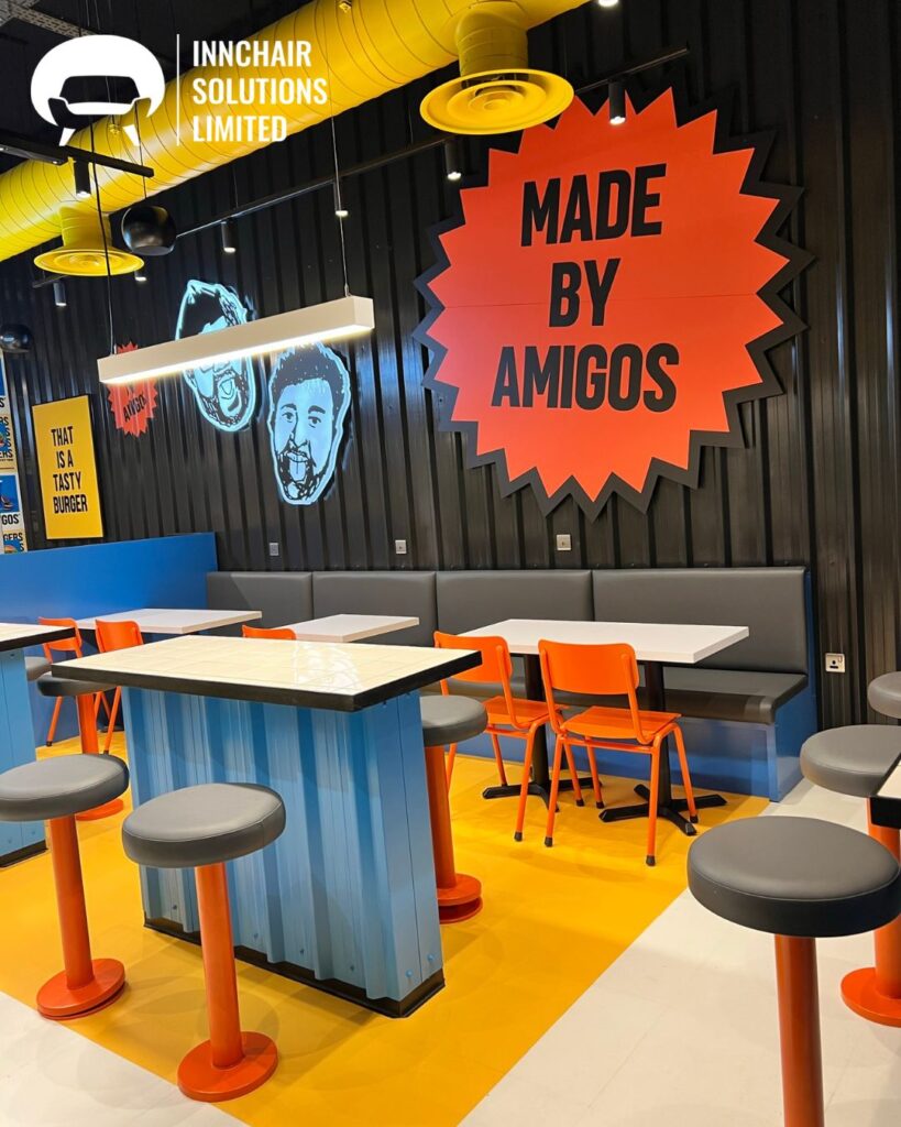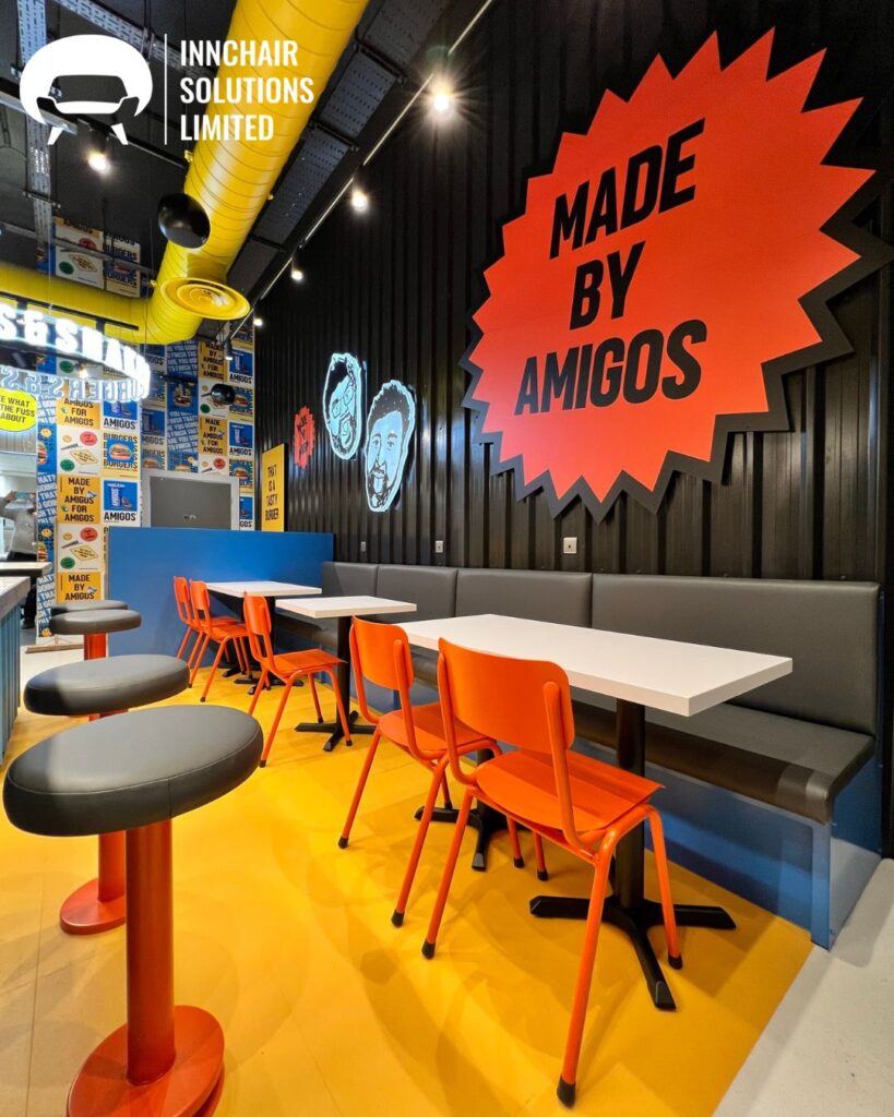 Amigos Burgers is a bold, energetic and fast-growing restaurant brand known for its vibrant interiors, high-energy customer atmosphere and distinctive street-food inspired identity. With a strong emphasis on colour, graphics and lively themes, Amigos restaurants aim to create spaces that feel youthful, modern and visually immersive. When the brand approached Innchair Solutions for a new seating installation, the goal was clear: to create furniture that reflects the brand’s personality while maintaining practicality, comfort and durability for a high-traffic quick-service restaurant (QSR).
